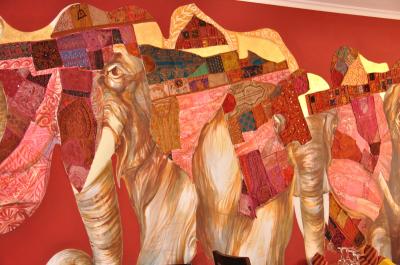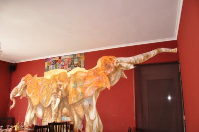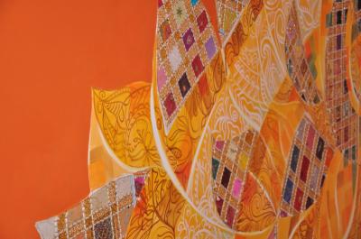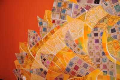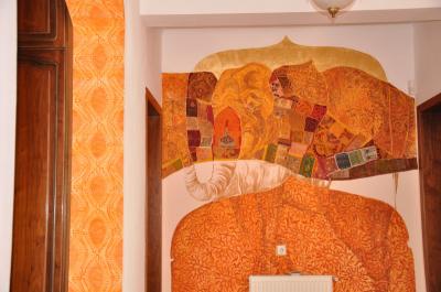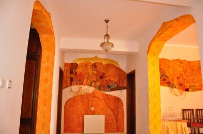 Picturile şi colajele murale (textil cu acril şi inserţii de oglindă) au fost puse în valoare prin lumina filtrată a geamurilor "vitrate" (pictate) în culori calde.